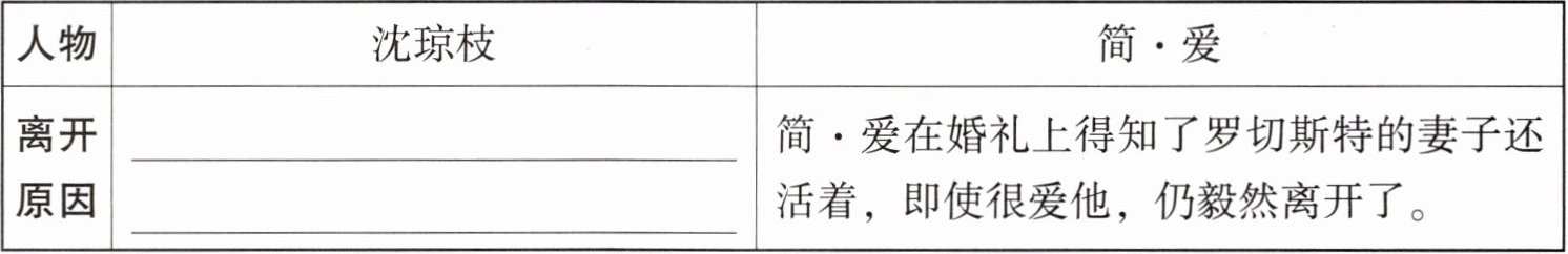 (1)【情节理一理】以上选文中两位人物面对婚姻的抉择时均选择了离开,但她们离开的原因各不相同,请你理一理沈琼枝离开宋家的原因。(2分)