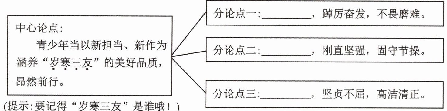 D B C 【解析】首先结合“中心论点”的内容和文化常识可知,“岁寒三友”指松、竹、梅,故可排除A项。然后仔细观察B、C、D三个选项,理解其内容并将其与各分论点进行匹配。B项中“青冥亦自守”赞扬了竹坚守节操的品性,契合分论点二;D项中“严冬斗雪开”赞扬了梅不畏严寒,昂然盛放的精神气质,契合分论点一;C项中的“终岁常端正”赞扬了松端正坚贞的品性,契合分论点三。