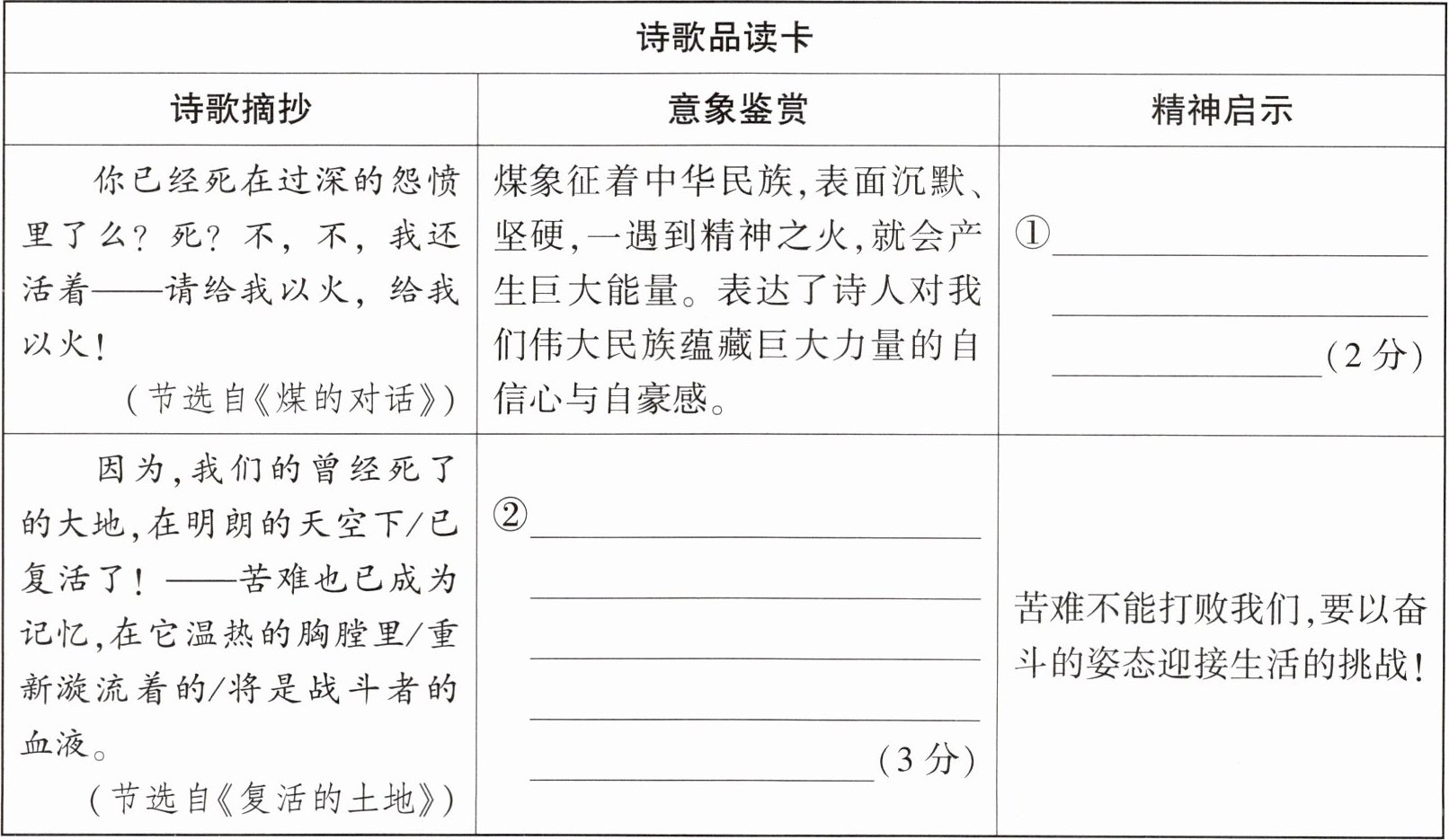 6. 从《艾青诗选》中汲取精神力量,有助于我们成为自强不息的人。下面是小深分享的“诗歌品读卡”,请你将表格中空缺的内容补充完整。(5 分)
