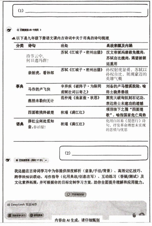 (1)示例:请从九年级语文下册古诗词中梳理关于用典的诗句,并对其进行分析。