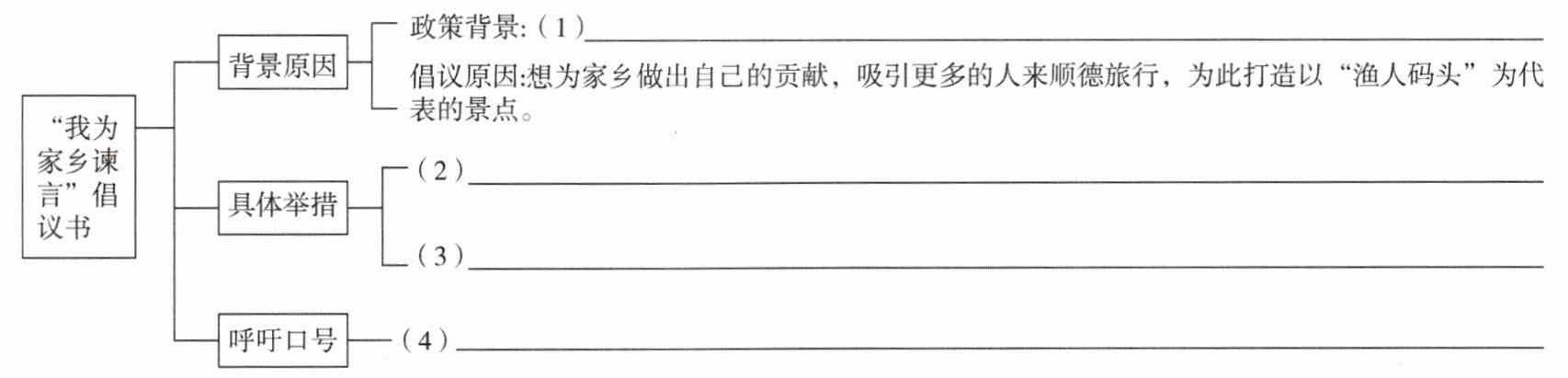 3. 【展·青年精神】小容在深入了解144小时过境免签政策后,他满怀热忱,渴望从自己力所能及之处着手,借着这股政策的春风,为家乡建设贡献自己的力量。小容想写一份倡议书,请你结合三则材料和链接材料帮助他完成倡议书的写作框架。(4分)(实用文体)