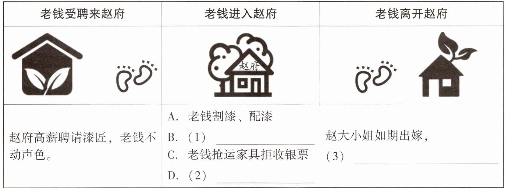1.【梳理·质疑】通读全文,跟随割漆匠老钱的行走足迹将小说的情节补充完整,再根据小说内容,提出你在阅读时的一处疑问。(4分)(感知归纳)