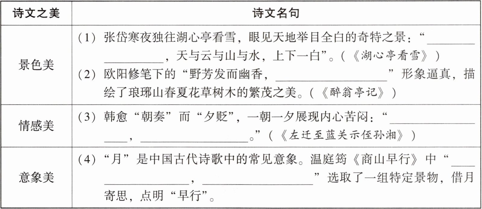5. 下面是以“诗文之美”为主题的诗文名句积累卡,请你把其中空缺处的诗文名句书写在横线上。(6分)