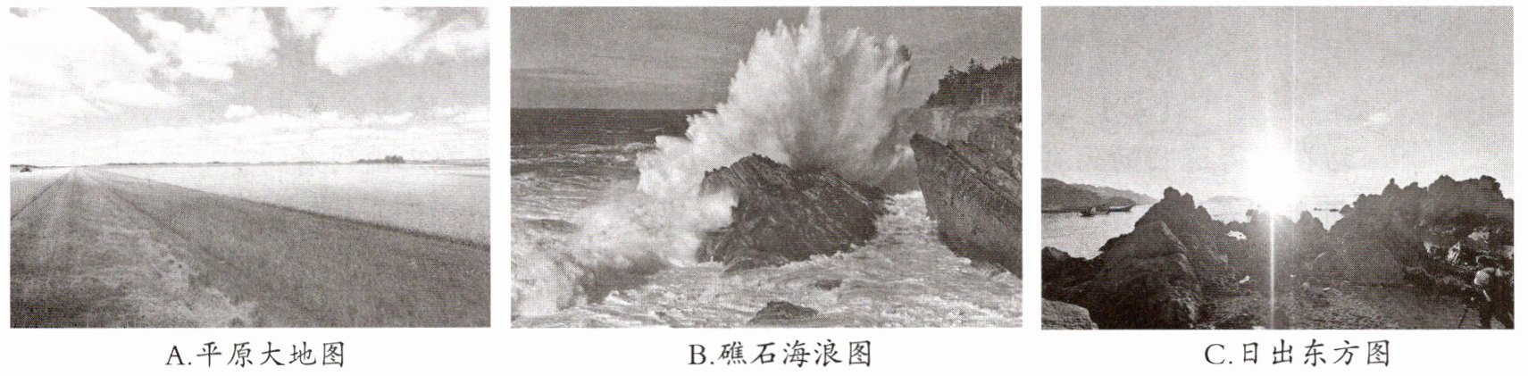 [新考法·跨学科]就个人而言,自强不息精神的内涵就是要自信自立、勤思苦学、勇于开拓。今年国庆节,语文老师让同学们做一份《艾青诗选》的手抄报。小深做好后想配一幅图,他找了以下三幅图片,不知道用哪一幅好,请你结合艾青诗歌的意象帮助他选一幅,并说说选择的理由。