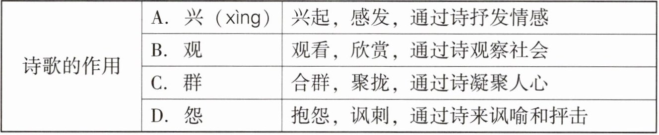 孔子说:“《诗》可以兴,可以观,可以群,可以怨。”这句话体现了诗歌的作用。关于“兴观群怨”的解释见下表。