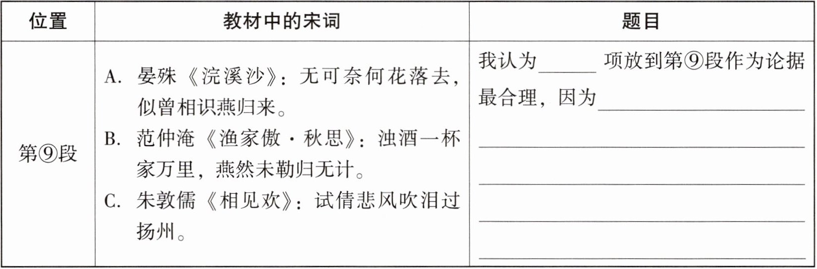 3. 小深同学在整理“论据要言之有据”的素材时,发现教材就是最好的资源库。下面开发的教材论据,哪项放到第⑨段作为论据最合理?请结合词人的时代背景或经历,从“论据与论点契合”的角度进行判断并谈谈理由。(3分)(论据)