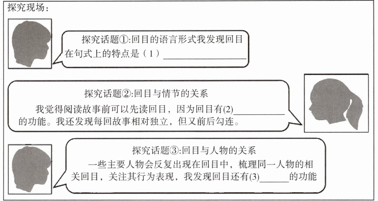 探究话题①:回目的语言形式我发现回目在句式上的特点是(1)对仗工整,句式整齐。