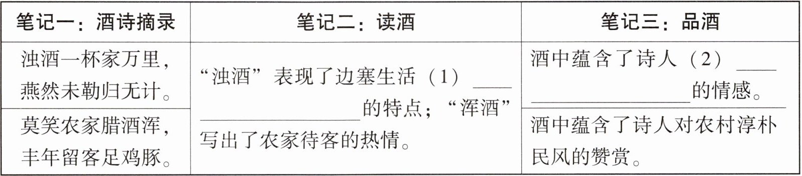 8. 诗词对比鉴赏有利于加深对作者情感的理解,请你根据范仲淹《渔家傲·秋思》和陆游《游山西村》的内容,补充下面的鉴赏笔记。(2分)