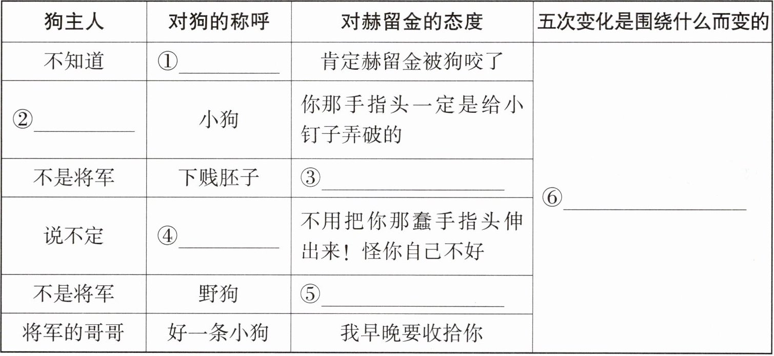 (1) ①野畜生、疯狗 ②将军 ③受了害,我们绝不能不管 ④名贵的狗 ⑤站在赫留金这边,准备弄死狗 ⑥狗主人是谁
