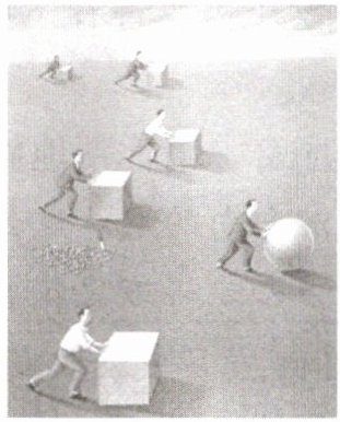 理由:画面中几个人在平坦的地面上推物前行。推着正方体的几人行走缓慢,只有一个推着球体的人遥遥领先,身后留下的工具和碎屑是他勇敢将正方体处理为球体的创新之举的有力见证。这幅漫画启迪我们:不要墨守成规。敢于创新才能不断超越!因此我将其命名为“打破陈规”。