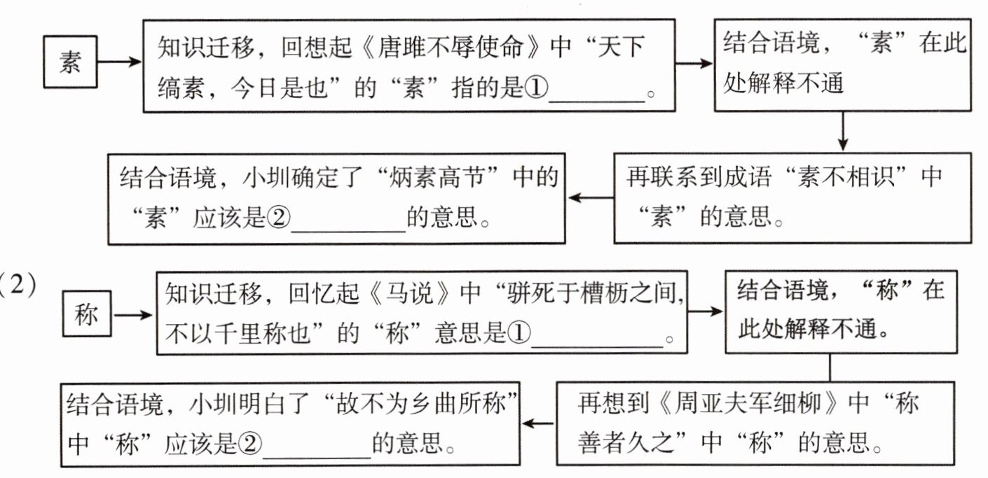 素→知识迁移,回想起《唐雎不辱使命》中"天下缟素,今日是也"的"素"指的是①______。→结合语境,"素"在此处解释不通→再联系到成语"素不相识"中"素"的意思。→结合语境,小圳确定了"炳素高节"中的"素"应该是②______的意思。