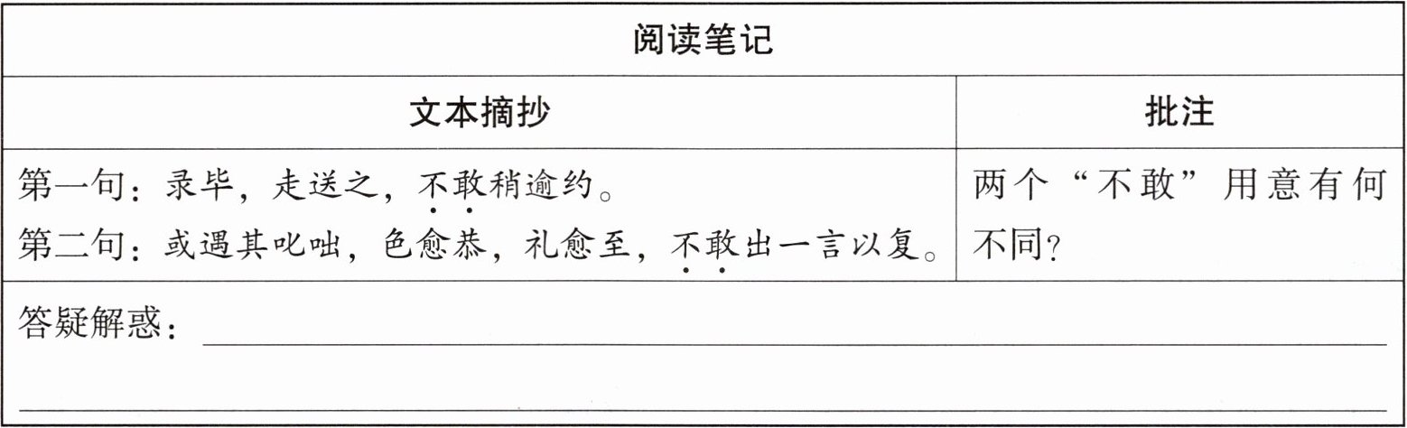 (2)以学生拜见老师的礼仪在颍昌拜见程颢,师生相处很是快乐。3. 第一句中的“不敢”表现了作者讲诚信、守信用的品质;第二句中的“不敢”表现了作者谦虚好学、求教诚恳的态度以及尊敬老师的品质。4. 示例:相同点是恭敬、尊重师长。评价:不完全赞同这种师生关系。古人尊师重教的优良传统应该继承发扬,严师出高徒,敬爱师长,虚心求教是我们必须恪守的美德,但同时也不能惟命是听,民主平等的师生关系是现代社会应该倡导的。