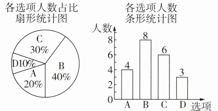 A 选项人数为 $20×20\% = 4$,B 选项人数为 $20×40\% = 8$,C 选项人数为 $20×30\% = 6$,D 选项人数为 $20×10\% = 2$,所以条形统计图中错误的是 D 选项的人数,正确的应该是 2 人。