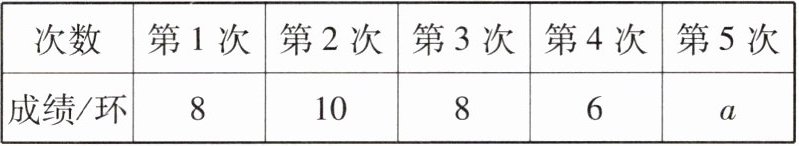(2)因为甲运动员前5箭的总成绩是$5 + 7 + 9 + 9 + 10 = 40$(环),甲、乙两名运动员前5箭的平均成绩相同,所以$a = 40 - 8 - 10 - 8 - 6 = 8$。故乙运动员第5次的成绩是8环。