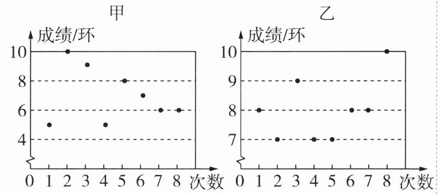 3 教材素材变式[2024烟台中考]射击运动队进行射击测试,甲、乙两名选手的测试成绩如图,其成绩的方差分别记为$s_{甲}^{2}和s_{乙}^{2}$,则$s_{甲}^{2}和s_{乙}^{2}$的大小关系是 (