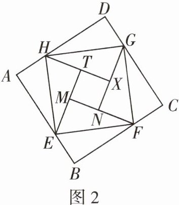 1 [新趋势·数学文化][2024南阳期末]勾股定理被记载于我国古代的数学著作《周髀算经》中,汉代数学家赵爽为了证明勾股定理,创制了一幅如图1所示的“弦图”,后人称之为“赵爽弦图”。图2由“弦图”变化得到,它是由八个全等的直角三角形拼接而成的,记图中正方形ABCD,正方形EFGH,正方形MNXT的面积分别为$S_{1},S_{2},S_{3}$,若$S_{1}+S_{2}+S_{3}= 24$,则正方形EFGH的面积为____