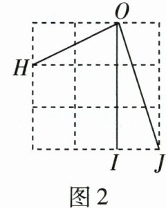 (4)如图2,在$3×3$的正方形网格中,每个小正方形的边长都为1,H,I,J,O四点都在正方形网格的格点上,求$∠HOI-∠IOJ$的大小。