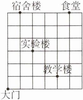 (1)若以大门为坐标原点,以水平向右为$x$轴的正方向,以铅直向上为$y$轴的正方向建立平面直角坐标系,用坐标表示下列位置:实验楼____;教学楼____;食堂____。