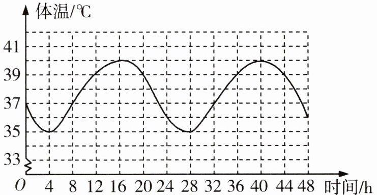 (1)由题中图象,知第一天即横坐标在 0 到 24 之间,在此范围内图象的最高点坐标是$(16,40)$,最低点坐标是$(4,35)$,故蛇的体温变化范围是 $ 35 \sim 40^{\circ}C $,它的体温从最低上升到最高需要 $ 16 - 4 = 12(h) $。