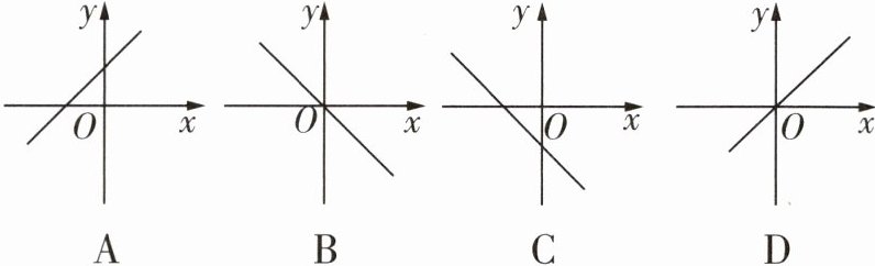 D 因为$4>0$,所以$y=4x$的图象经过第一、三象限,$y$随$x$的增大而增大。因为$-7<0$,$-\frac{4}{5}<0$,所以$y=-7x$,$y=-\frac{4}{5}x$的图象均经过第二、四象限,$y$随$x$的增大而减小,故A项、B项、C项均不符合题意;因为三个函数均是正比例函数,所以三个函数的图象都是经过原点的直线,故D项符合题意。