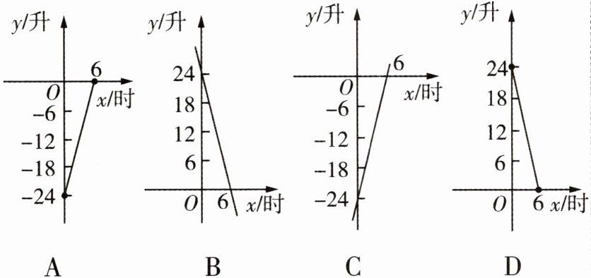 3 [2024淮南大通区期末]拖拉机开始工作时,油箱中有油24升,如果每小时耗油4升,那么油箱中的余油量y(升)与工作时间x(时)之间的函数关系的图象为(