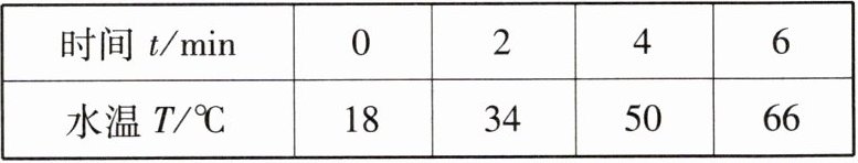 B 由题中表格可知,时间每增加2min,温度升高16℃,因此水温T是时间t的一次函数,所以设水温T与时间t的关系式为T = kt + b(k≠0),因为t = 0时,T = 18,所以b = 18,又因为t = 2时,T = 34,所以2k + 18 = 34,所以k = 8,所以一次函数的表达式为T = 8t + 18,把T = 90代入,得90 = 8t + 18,解得t = 9,所以可预测水温达到90℃的时间是9min。