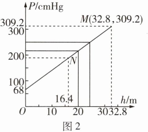 A 由题中图象可知,直线 $ P = k h + P _ { 0 } $ 过点 $ ( 0,68 ) $ 和 $ ( 32.8,309.2 ) $,所以 $ P _ { 0 } = 68 $,$ 32.8 k + P _ { 0 } = 309.2 $,所以 $ k = \frac { 603 } { 82 } $,所以函数关系式为 $ P = \frac { 603 } { 82 } h + 68 $,故 D 错误;青海湖水面大气压强为 $ 68.0 \mathrm { cmHg } $,故 B 错误;根据实际意义,$ 0 \leq h \leq 32.8 $,故 C 错误;将 $ h = 16.4 $ 代入函数关系式,则 $ P = \frac { 603 } { 82 } \times 16.4 + 68 = 188.6 $,即青海湖水深 $ 16.4 \mathrm { m } $ 处的压强为 $ 188.6 \mathrm { cmHg } $,故 A 正确。
