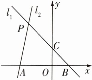 1 [2024宿迁宿城区期末]如图,已知直线$l_{1}:y= kx+2$与x轴交于点B,与y轴交于点C,与直线$l_{2}:y= 5x+20交于点P(-3,a)$,直线$l_{2}$与x轴交于点A。