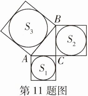 直角 由题意,得S₁ = π($\frac{1}{2}$AC)² = $\frac{1}{4}$πAC²,S₂ = π($\frac{1}{2}$BC)² = $\frac{1}{4}$πBC²,S₃ = π($\frac{1}{2}$AB)² = $\frac{1}{4}$πAB²。因为S₁ + S₂ = S₃,即$\frac{1}{4}$πAC² + $\frac{1}{4}$πBC² = $\frac{1}{4}$πAB²,所以AC² + BC² = AB²,所以△ABC为直角三角形。