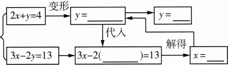 把③代入④,得 $2(3y - 3) - y = 4$,解得 $y=$