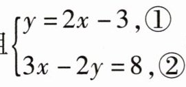 解:$\begin{cases}y = 2x + 1,① \\ 3x - 2y = 2,②\end{cases}$