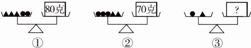 A 由题意,得$\begin{cases}3▲ + 2● = 80,①\\3● + 2▲ = 70,②\end{cases}$ ① + ②,得$5▲ + 5● = 150$,所以$▲ + ● = 30$,即需要在天平右盘中放入砝码30克。