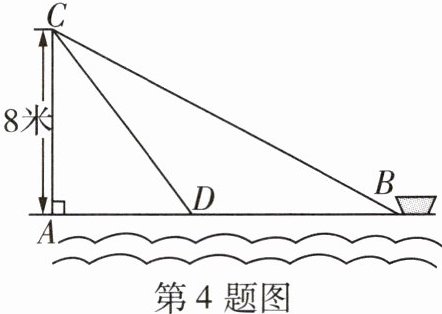 4 [2025重庆黔江区期末]如图,在离水面高度为8米的岸上,有人用绳子拉船靠岸,开始时绳子BC的长为17米,几分钟后船到达点D的位置,此时绳子CD的长为10米,则船向岸边移动了