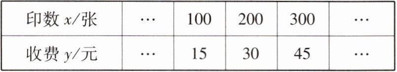 解:由题意设甲印刷社的收费$y$(元)与印数$x$(张)之间的函数关系式为$y = kx + b$,由题意,得$\left\{\begin{array}{l} 15 = 100k + b\\ 30 = 200k + b\end{array}\right. $,解得$\left\{\begin{array}{l} k = 0.15\\ b = 0\end{array}\right. $,所以甲印刷社的收费$y$(元)与印数$x$(张)之间的函数关系式为