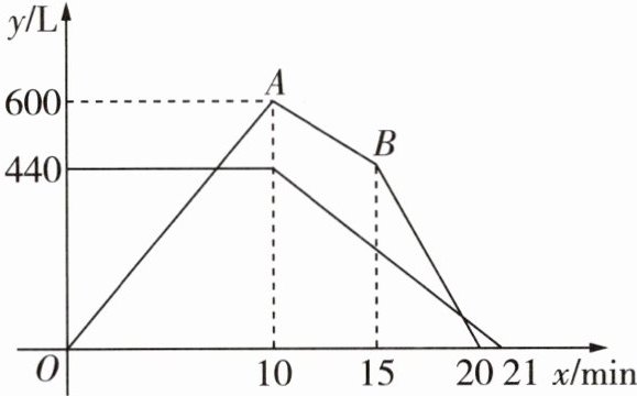(1)$60$ $40$ 由题中图象可知,甲容器进水管的注水速度是$\frac{600}{10}=60(L/min)$,乙容器出水管的排水速度是$\frac{440}{21 - 10}=40(L/min)$。