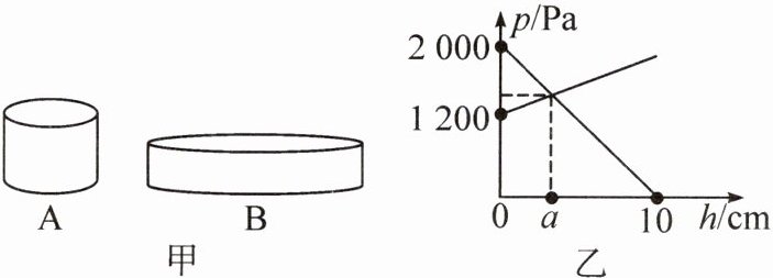 (1)从 A 上沿水平方向截取高为 h 的圆柱体,并将截取部分平放在 B 的中央,则 A 对桌面的压强逐渐减小,B 对桌面的压强逐渐增大,结合题图乙可以判断出 A 最初对桌面的压强是 2000 Pa,均匀柱体对桌面的压强$p=ρgh$,则圆柱体 A 的密度$ρ_{A}=\frac {p_{A}}{gh_{A}}=\frac {2000Pa}{10N/kg×0.1m}=2×10^{3}kg/m^{3}$。
