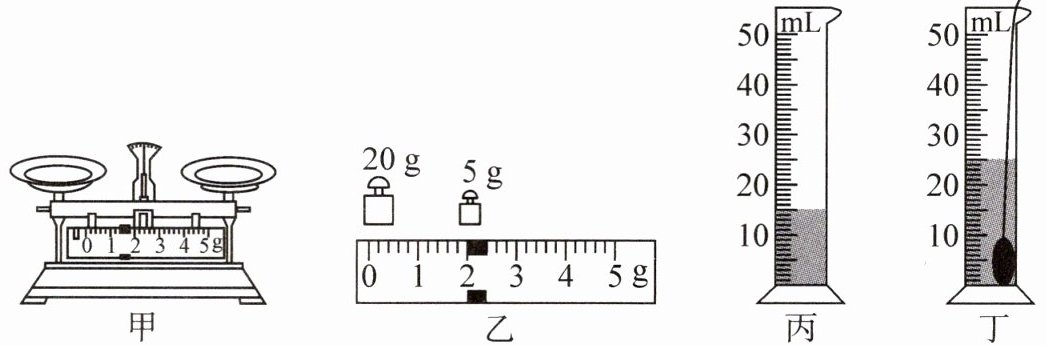 (3)小明纠正错误重新调平后,将小石块放在左盘,在右盘中加减砝码并调节游码直到横梁平衡。这时右盘中的砝码情况和游码位置如图乙所示,则小石块的质量为______g。如图丙和丁所示,小明利用排水法测出小石块的体积为______$cm^3$,并算出了小石块的密度为______ $kg/m^3$。
