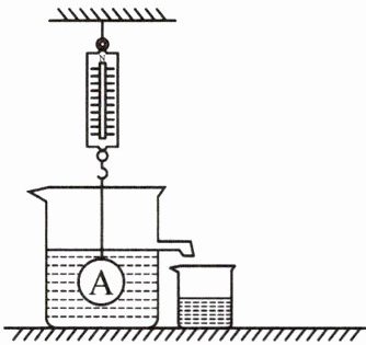 6.如图所示,水平桌面上有一个溢水杯,溢水杯中装满水,将小球A放入溢水杯中静止时,从溢水杯中溢出水的体积为$10⁻^4 m^3,$弹簧测力计的示数为3 N,则小球A在溢水杯中受到的浮力为____N,小球A的密度为______ $kg/m^3$。(ρ水$= 1.0×10^3 kg/m^3,g$取10 N/kg)
