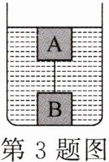 3.如图所示,体积相同的两个物体A、B用不可伸长的细线系住,放入水中后,A刚好完全没入水中,细线被拉直。已知A重6N,B受到的浮力为8N,A、B密度之比为3:5。以下说法不正确的是()($ρ_{水}= 1.0×10^{3}kg/m^{3}$)