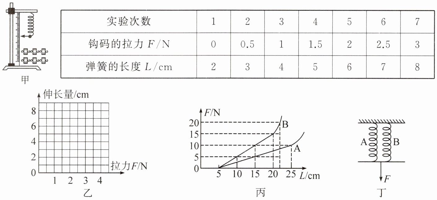 (3)小明又对两根原长相同、粗细不同的弹簧A、B进行研究,记录弹簧受到的拉力大小F和弹簧的长度L,根据多组测量数据作出了如图丙所示的图线。