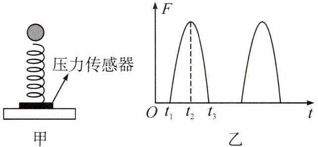4.如图甲所示,质量不计的弹簧竖直固定在水平面上,$t= 0$时刻,将一金属小球从弹簧正上方某一高度处由静止释放。小球接触弹簧并将弹簧压缩至最低点(形变在弹性限度内),然后又被弹起离开弹簧。小球上升到最大高度后又下落,如此反复,不计空气阻力。通过安装在弹簧下端的压力传感器,可测出该过程中弹簧弹力F随时间t变化的图像如图乙所示,则()