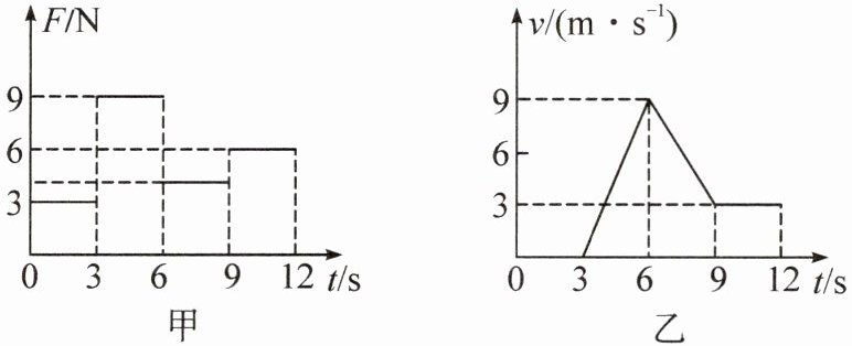 6.放在水平地面上的某物体受到水平向右的力F的作用,力F的大小以及物体的运动速度大小v随时间t的变化情况分别如图甲、乙所示。根据图像信息回答:当$t= 7s$时,物体受到的摩擦力的大小为____N,方向为______。9~12s内,物体克服摩擦力做的功是_____J。