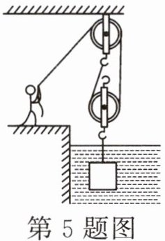 5.码头工人利用如图所示的装置将体积为$8×10⁻^3m^3$的金属物块打捞上岸,在1min内使金属物块匀速升高了6m,工人对绳子的拉力大小为400N,此过程中金属物块没有露出水面,不计绳重及摩擦。下列判断正确的是(已知金属物块的密度为$8.0×10^3kg/m^3,g$取10N/kg)()
