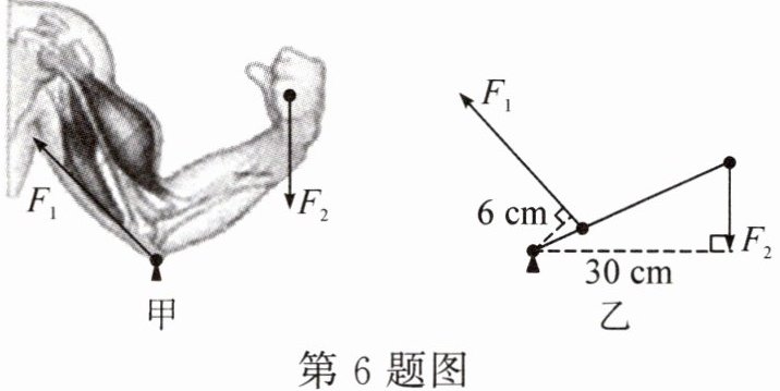6.某天,“生物”大师和“物理”大师在一起进行体育锻炼,“生物”大师伸出健硕的手臂对“物理”大师说:“看,我能提起很重的物体哦!”“物理”大师竖起大拇指说:“真厉害!其实,你的前臂就是物理学中的一根杠杆。”图甲是人体肱二头肌工作时的原理图,我们可以将这幅图简化成如图乙所示的杠杆。由所学知识可知,人的前臂属于______杠杆,若图乙中$F_2$为重20N的铅球对水平摊开的手掌的压力,小臂在图乙中的位置平衡,则肱二头肌对小臂的拉力$F_1= ______N。$