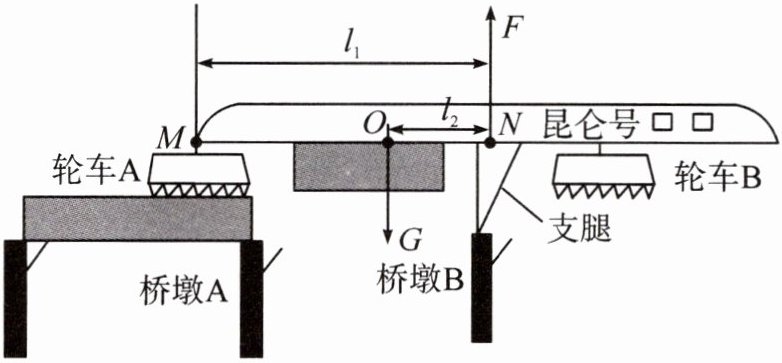 (3)如图所示,“昆仑号”将箱梁运到桥墩A、B之间的正上方时水平静止。图中$l_1$表示MN的水平距离$,l_2$表示ON的水平距离,G表示“昆仑号”与箱梁受到的总重力(不包括轮车A受到的重力),其重心在O点,F表示桥墩B上的支腿对“昆仑号”竖直向上的支持力,请推导支持力F大小的表达式(用字母表示)。
