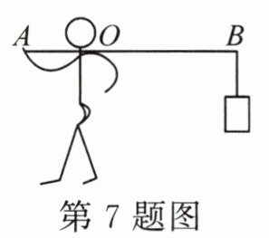 7.如图所示,某人用一根轻质木棒挑着重为120N的物体站在水平地面上,木棒保持水平,木棒AB长为1.2m,重物悬挂处到肩膀的距离BO为0.8m,则手在A端对木棒竖直向下的作用力大小为______N。