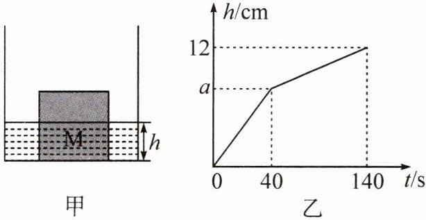 (1)物块M的体积为$V=(0.1m)^{3}=0.001m^{3}$,物块M的质量为$m=\frac {G}{g}=\frac {8N}{10N/kg}=0.8kg$,物块M的密度为$ρ_{M}=\frac {m}{V}=\frac {0.8kg}{0.001m^{3}}=0.8×10^{3}kg/m^{3}<ρ_{水}=1.0×10^{3}kg/m^{3}$,即物块M的密度小于水的密度,由题图乙可知,当$t=140s$时,水的深度为$h=12cm$,大于立方体物块M的边长L,则根据浮沉条件可知,物块M将在水中漂浮。