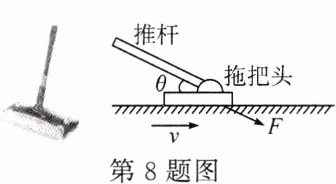 8.如图所示,在拖把的推杆上用力 F 推着拖把头沿水平向右方向拖地,此时拖把头和地面之间产生的是____(填摩擦种类),拖把头受到地面的摩擦力的方向是____(选填“水平向左”或“和力 F 方向相反”)。