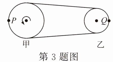 3.如图所示为皮带传动装置,甲为主动轮,传动过程中皮带不打滑,P、Q分别为两轮边缘上的两点,下列说法正确的是()