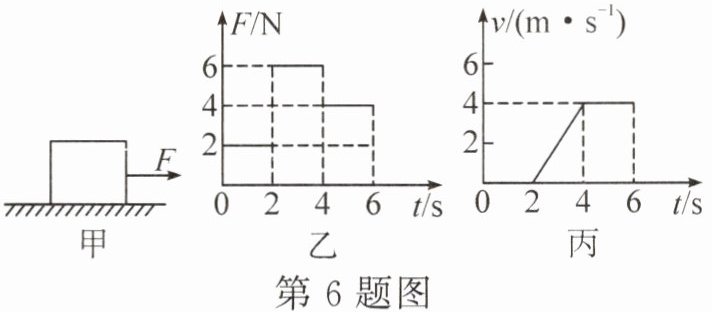 6.如图甲所示,放在水平地面上的物体,受到水平向右的拉力F的作用,F的大小与时间t的关系如图乙所示,对应的物体运动速度v与时间t的关系如图丙所示,分析图像可知:当t= 1s时,物体受到的摩擦力为____N;当t= 5s时,物体受到的摩擦力为____N;当t= 3s时,物体受到的摩擦力为____N。